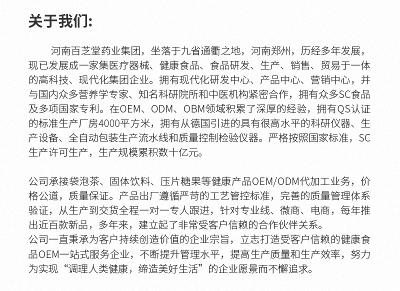 河南百芝堂药业集团有限公司是一家专业从事压片糖果、固体饮料、袋泡茶等营养保健食品和预包装食品生产代加工及ODM/OEM贴牌服务的综合性技术企业。高端技术 先进设备 一站式服务,致力打造河南健康食品品牌,您的放心选择!
