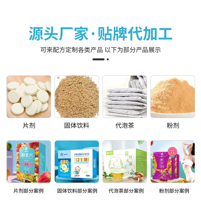 固体饮料、 粉剂、 片剂、代用茶、 袋泡茶、 压片糖果、 代餐粉/奶昔、胶原蛋白肽、膳食纤维等