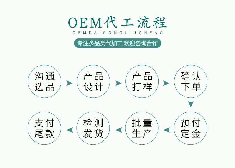 OEM代加工方案: 1、用您自己的品牌,我们包工包料给您贴牌生产; 2、根据您提供的配方来加工定制; 3、按您提供的样品来加工定制; 4、公司可自己提供原料,我们来为您代工生产; 5、可用您的外包装盒,内在产品我来完成; 6、您可以用我公司品牌定制独立的外包装盒,作为您独自销售的产品。 本公司OEM贴牌代加工的特点与实力: 1、产品设施,有多家厂房,可以达到客户不同需求; 2、原料选自信赖厂家,并且有相应的生产资质检测报告; 3、检验仪器,完成产品常规及出厂检验要求,根据客户要求,可帮忙第三方代送检; 4、价格合理,完成客户不同定价、定量需求,诚信经营; 5、证件齐备,完成客户市场拓展工作,让您放心的销售; 6、一对一客户服务,合作交流顺畅,一站式的服务,为您节约宝贵时间。