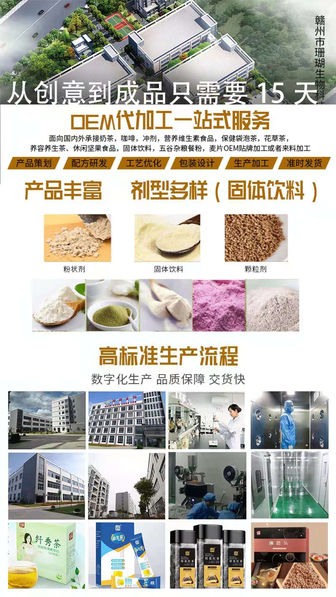 江西珊瑚生物科技有限公司面向国内外承接固体饮料加工生产,贴牌定奶茶,咖啡,冲剂,营养维生素食品,袋泡茶,花草茶,,固体饮料,营养餐粉,麦代片OEM贴牌加工或者来料加工,全程无尘车间,质量保证,江西珊瑚生物科技有限公司旗下赣州珊瑚生物科技有限公司专业生产制造工厂,18年的生产研发生产一体化工厂,10万级净化车间,专业固体饮料、功能食品、营养食品生产制造。属于高新技术企业,国家行业标准起草单位之一,交货及时全程保姆式服务为全国客户提供贴牌定制,欢迎到工厂实体考察定制。欢迎全国有意者考察洽谈合作。