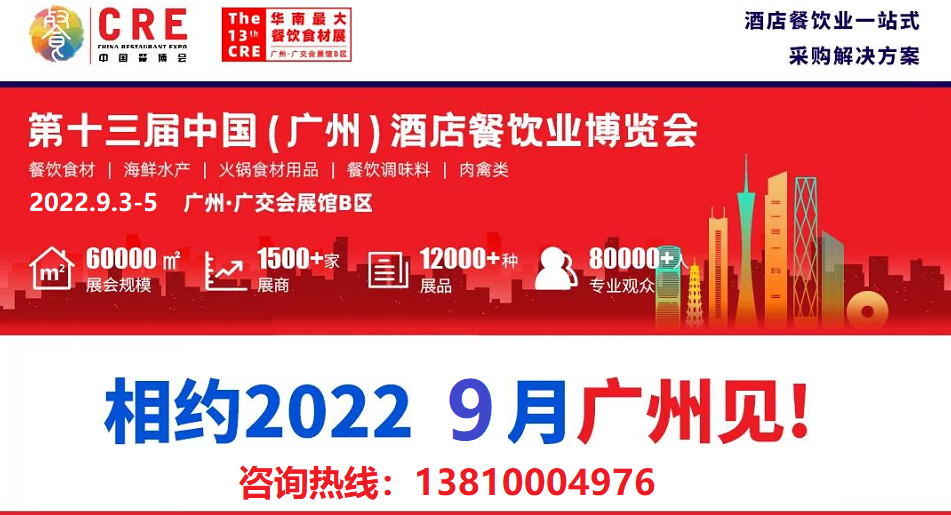 2022第13届CRE中国(广州)酒店餐饮业博览会(以下简称:第13届CRE中国餐博会),将于2022年9月3-5日,广州·广交会展馆B区一楼盛大举办!由广东省餐饮服务行业协会与广东省团餐配送行业协会共同主办。本届展会规模达6,0000㎡、预计吸引8,0000+专业观众、1500+知名品牌、有1,2000种产品展示、30+场同期论坛赛事活动。CRE中国餐博会整合餐饮全产业链优势资源,将大力推动餐饮业上中下游,迎合中国酒店餐饮业高速增长、满足业界不同领域业务需求而打造的全产业链、全渠道整合、高效交流平台,聚力打造2022华南餐饮业年度盛会,共同开拓中国餐饮业市场蓝海,为全国餐饮业发展注入强劲新动能!